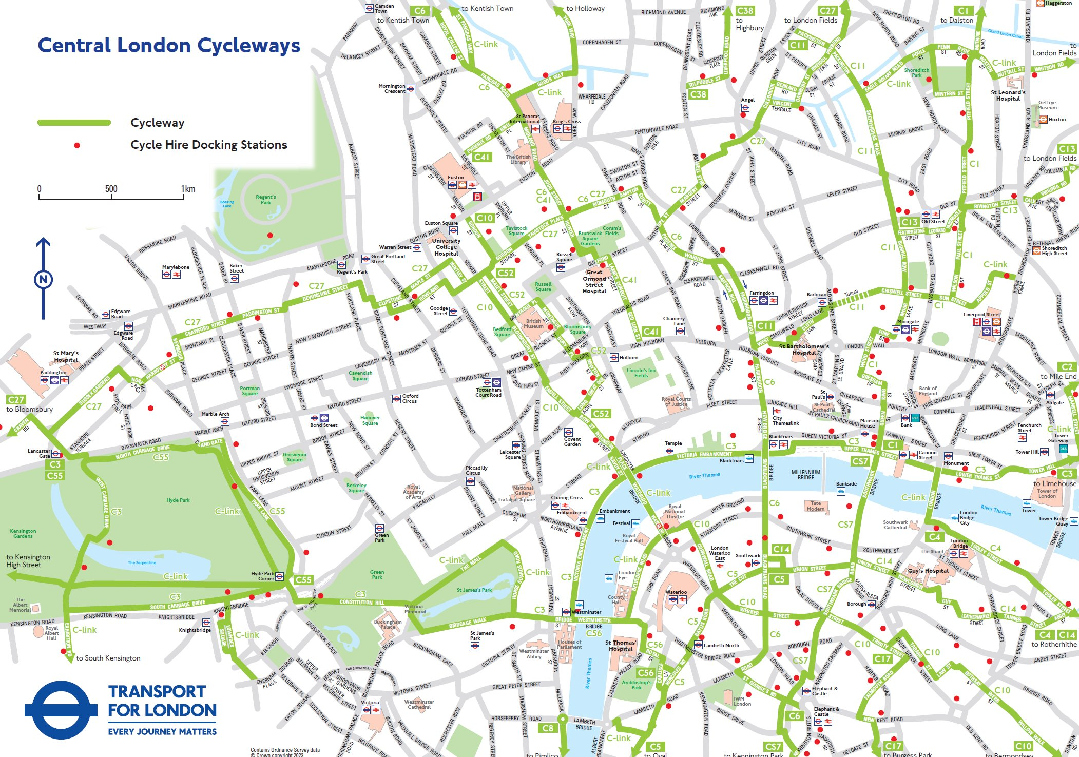 Transport for London also have a good cyclemap on their website. This just shows TfL cycleways. Use ones labelled CS or C (don’t bother with the ones labelled Q). Transport for London have also mapped central London cycleways and Santander docking stations as of Spring 2023 (see below).